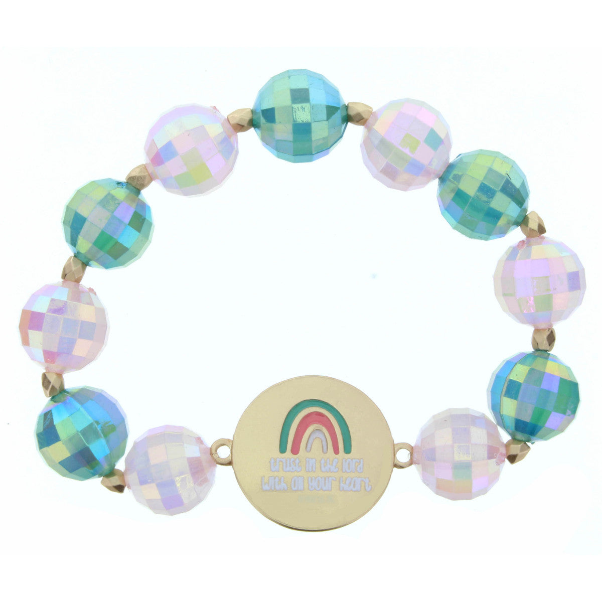 KIDS TEAL & PINK LARGE BEADED STRETCH BRACELET WITH "TRUST IN THE LORD WITH ALL YOUR HEART" PROVERBS 3:5 RAINBOW DISK BRACELET
