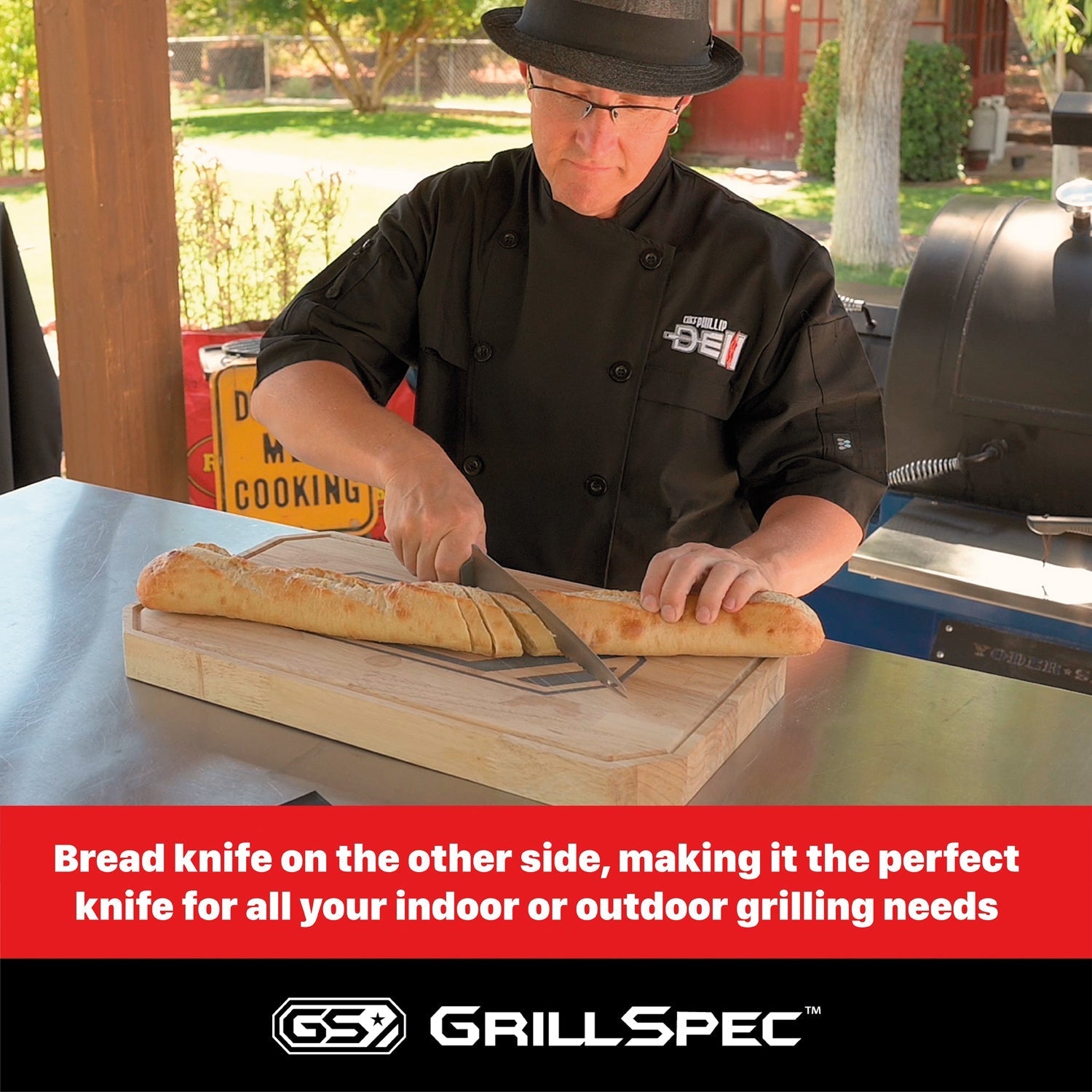 THE GRILLSPEC Viper Multi-Use Grill Knife is one of a kind design patented dual sided knife that has a razor sharp chefs blade on one side and a serrated bread blade on the other making it the perfect knife for all your indoor or outdoor grilling needs. Plus it has a turning fork tip to help flipping meats when your grilling plus a bottle opener for those thirsty afternoons. A chefs knife, a bread knife, a turning fork and a bottle operner, all in one. Need we say more. Oh, plus its made with a raised guard that keeps the blade elevated when laid on a flat surface so no messy tables. Comes with a plastic blade protector.