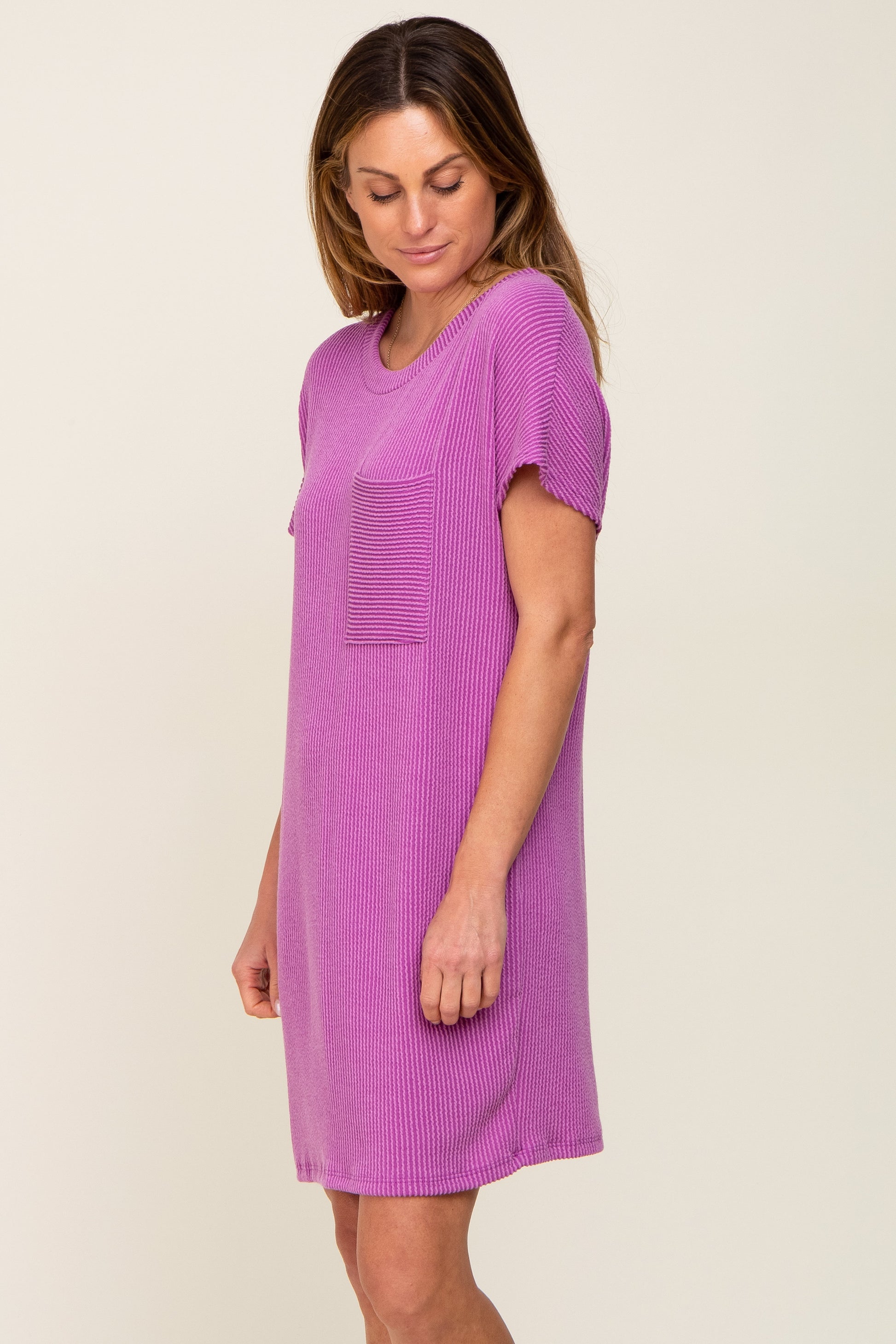 Violet Ribbed Front Pocket Dolman Short Sleeve Dress