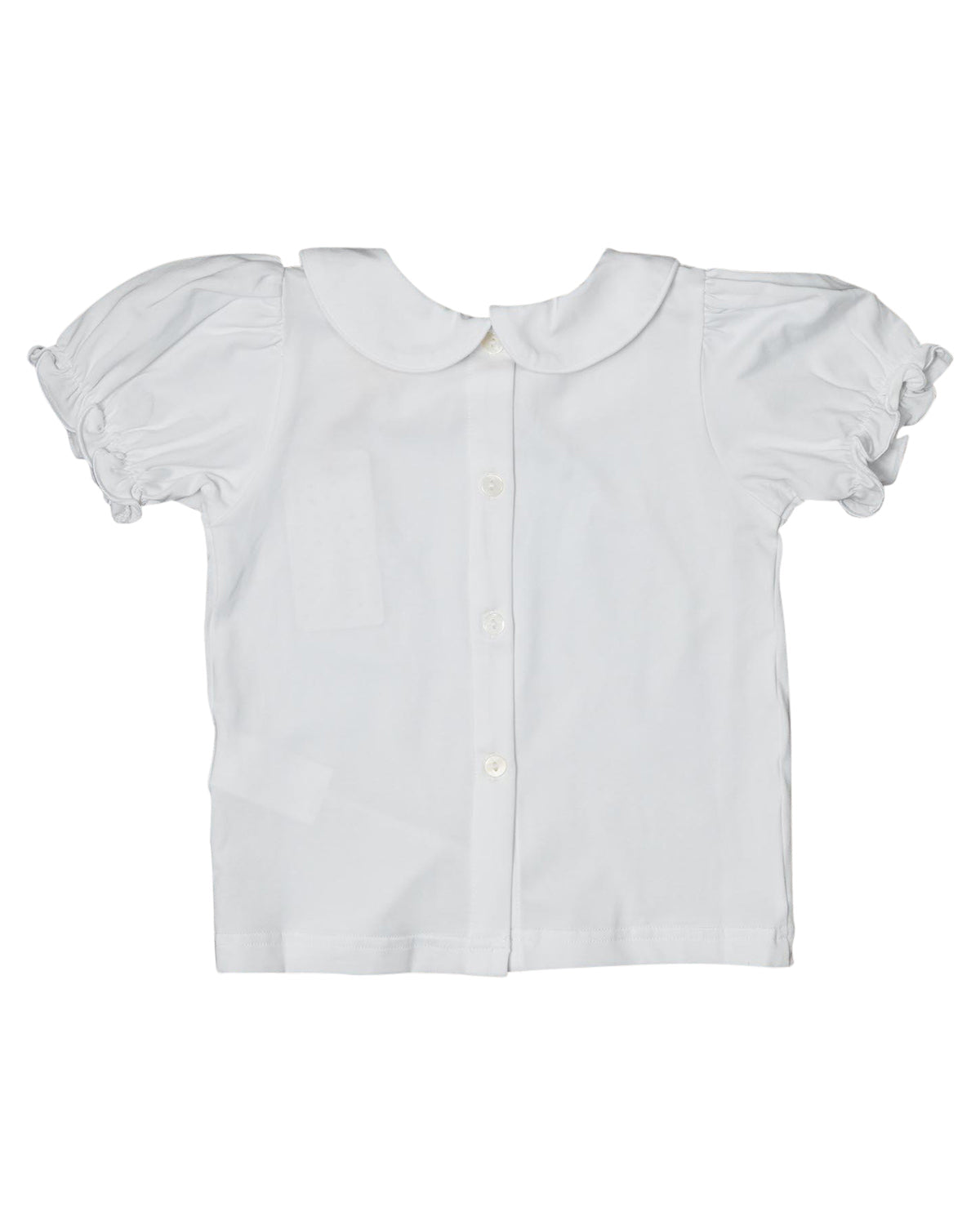 This white knit cotton short sleeve shirt with buttons down back is the perfect addition to any little ones wardrobe. This peter pan style collared shirt with little ruffle puff sleeves is perfect to wear under jumpers, bubbles, and bloomer sets, or by itself as a staple shirt. This soft and stretchy knit is the perfect combination between classic and comfort.