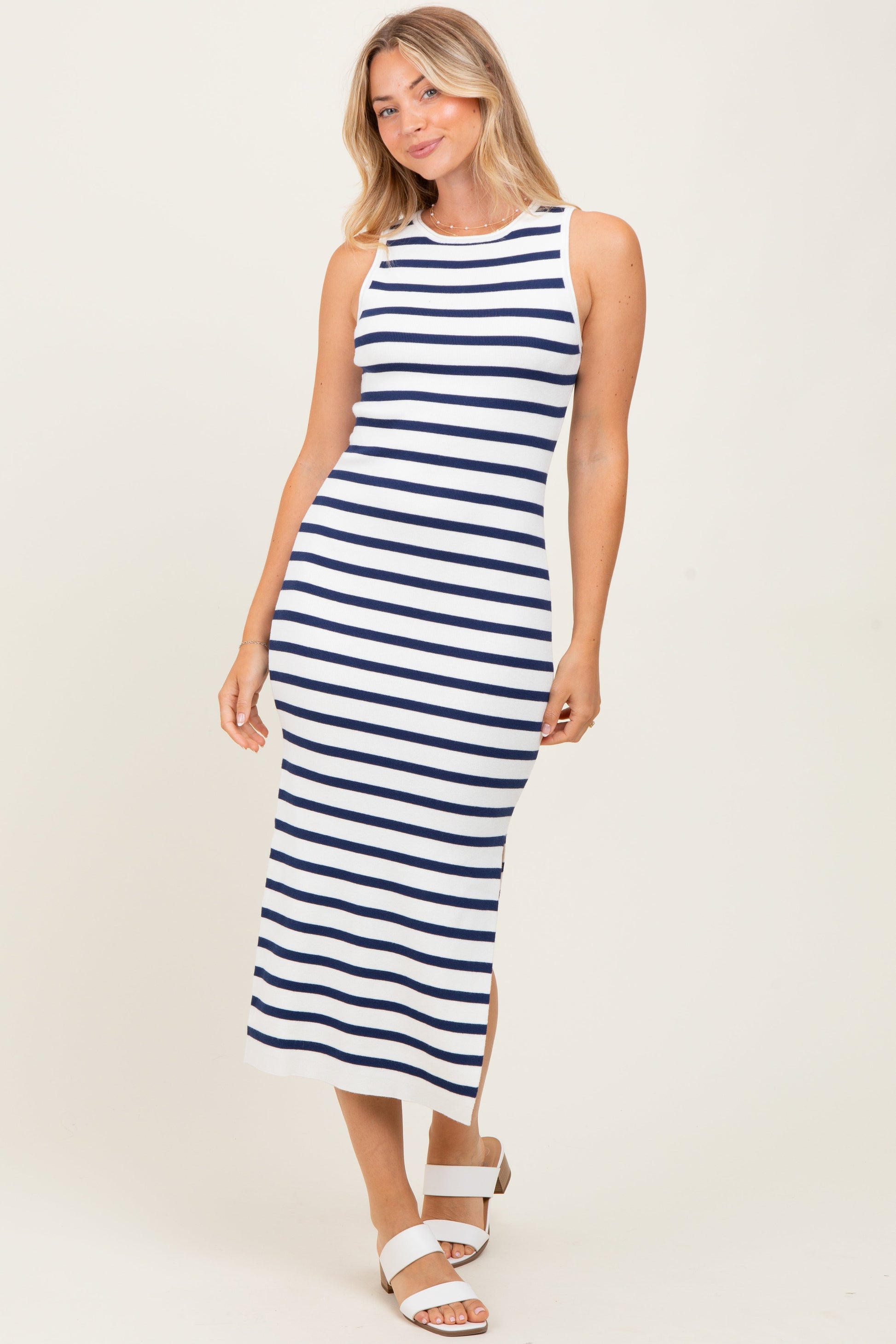 White Navy Striped Knit Sleeveless Side Slit Midi Dress