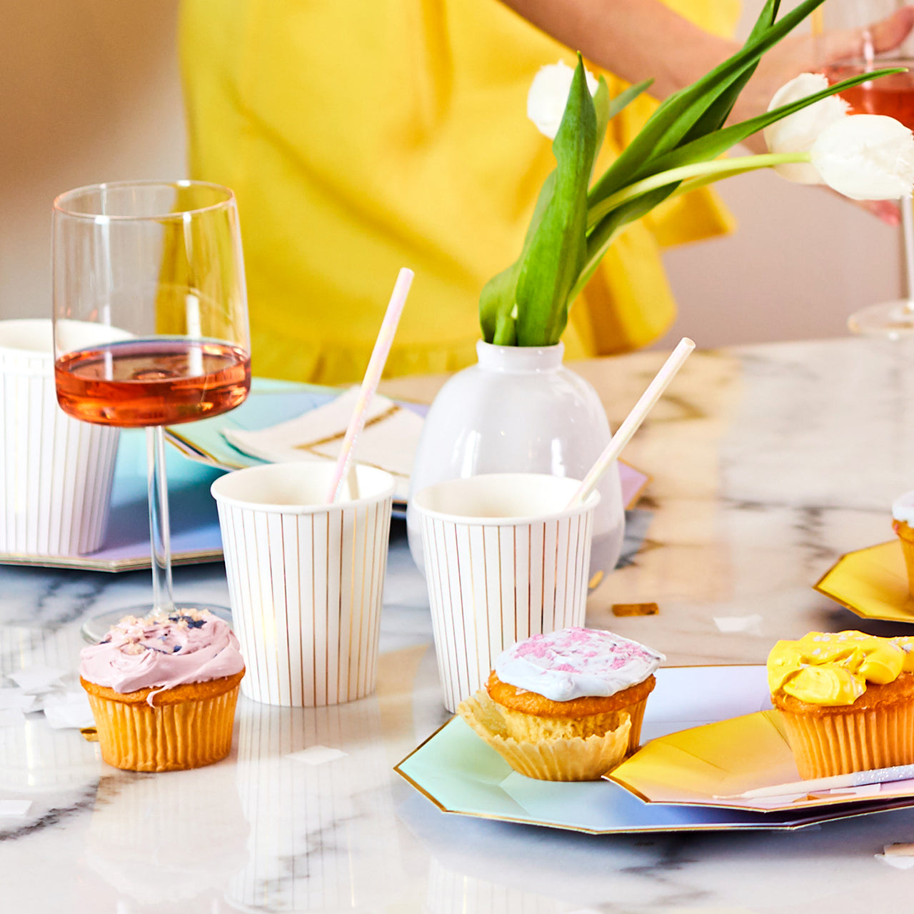 You can't go wrong with this classic cup. It's made from crisp white that's thinly striped with gold for an upscale but uncomplicated vibe. Includes 10 cups.