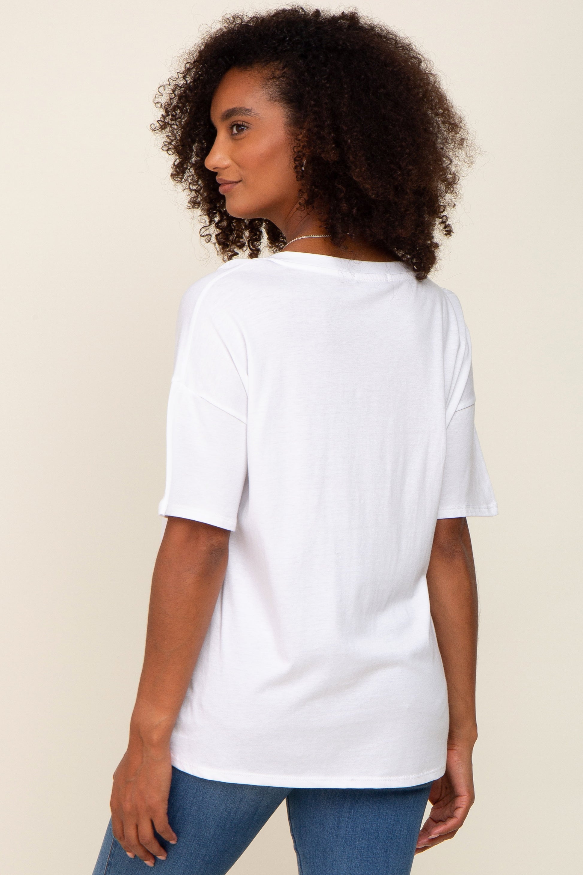 A solid top featuring a front pocket, short sleeves, a v-neckline and side slits.
