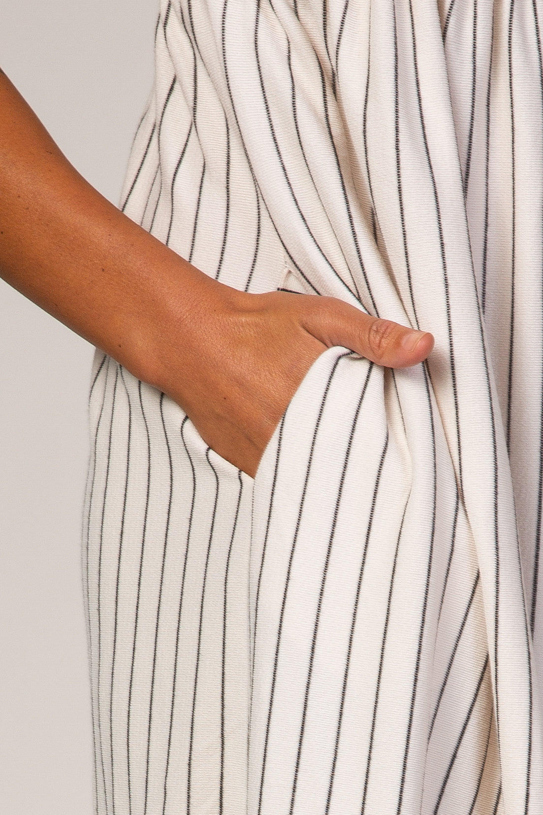 A striped babydoll dress with an elastic waist with pleating details, pockets, and a rounded neckline.