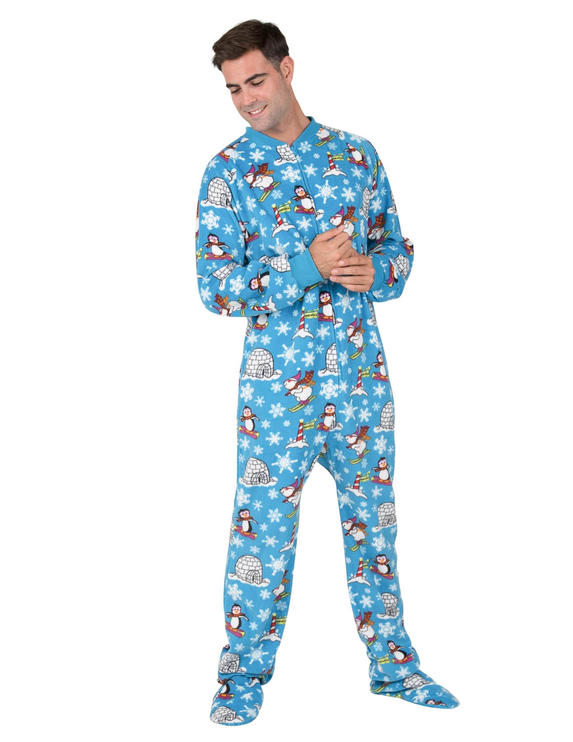 Winter wonders abound in these whimsical feel good footies for men and women! Polar bears ski and penguins snowboard past igloos and the North Pole sign during a blizzard as snowflakes fall with fury! Feel good footed pajamas for plus sizes and all other categories brighten and warm any cold and dreary winter day! Soft and durable polar fleece will bring comfort and last all season long!