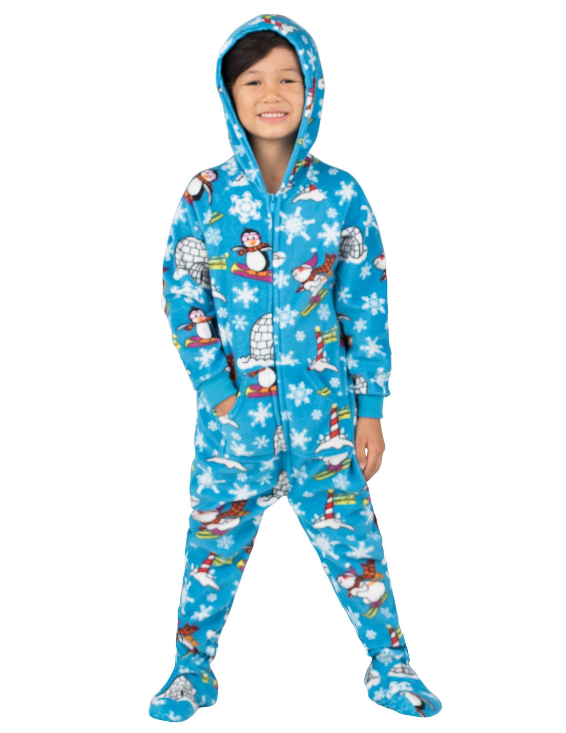 Winter wonders abound in these whimsical feel good footie pajamas for toddler boys and girls! Polar bears ski and penguins snowboard past igloos and the North Pole sign during a blizzard as snowflakes fall with fury! Soft and durable polar fleece will bring comfort and last all season long! Features include front pockets and hoodie. Superior quality, durable and fun!
