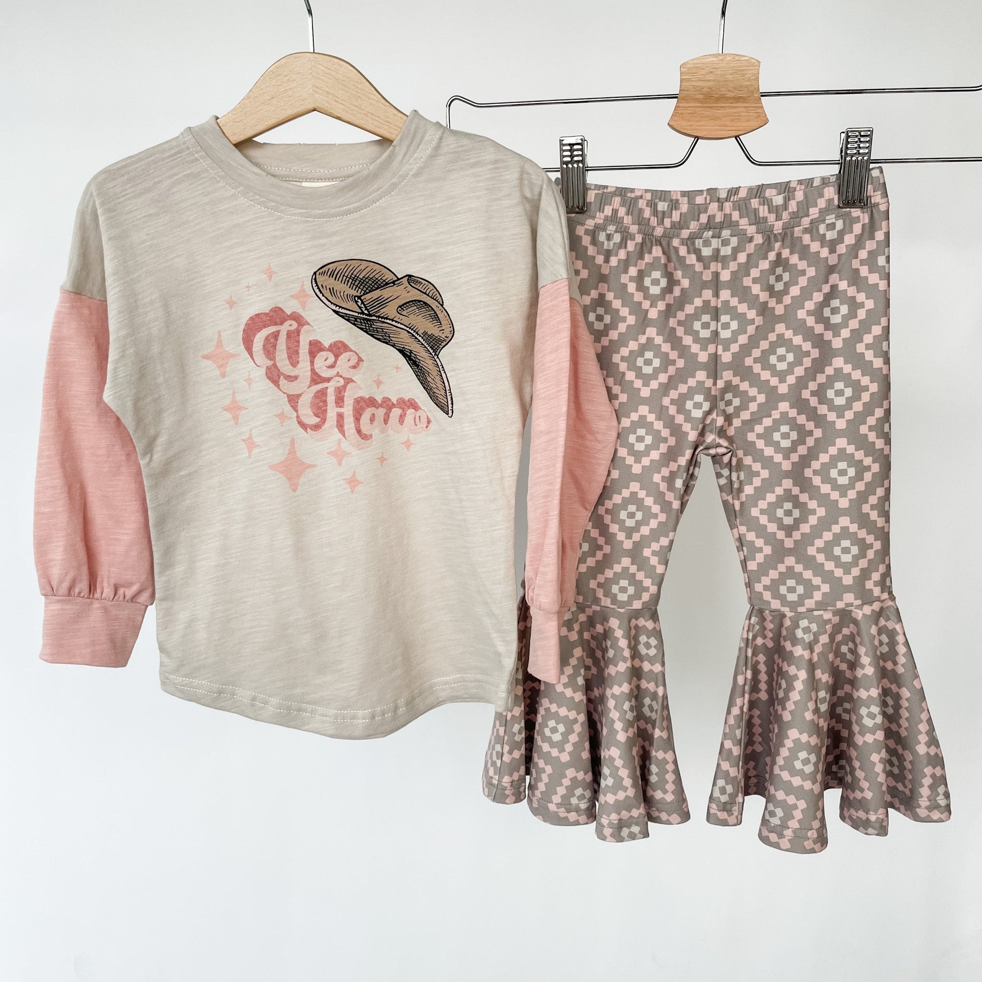 Yee Haw long sleeve Rockin Bottom Graphic Tee shirt is made from 100% cotton, offering comfort and style. It feature a distressed hem at the neck for a trendy, vintage look. This tops pair perfectly with our Bell Bottom Pants and are the ideal complement to our ruffled headbands or clippys. Note: Bell bottoms are sold separately.