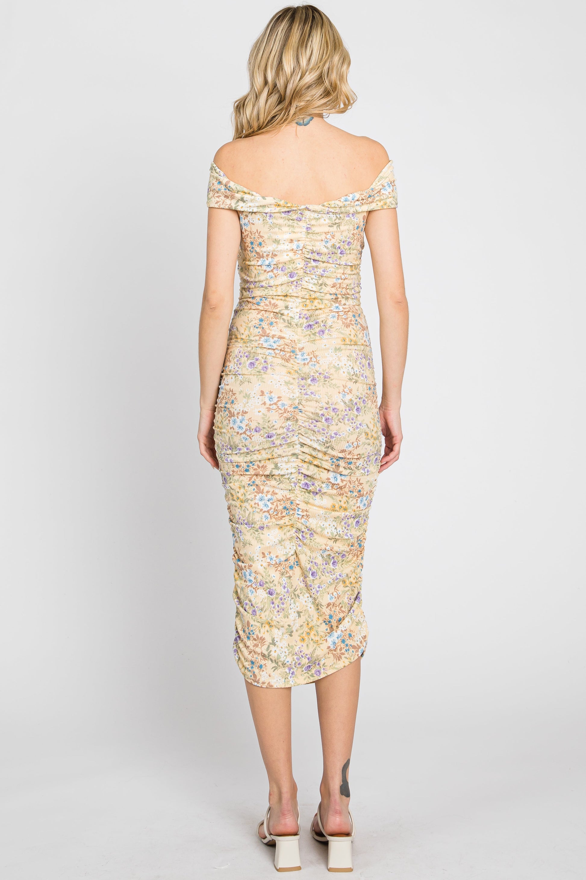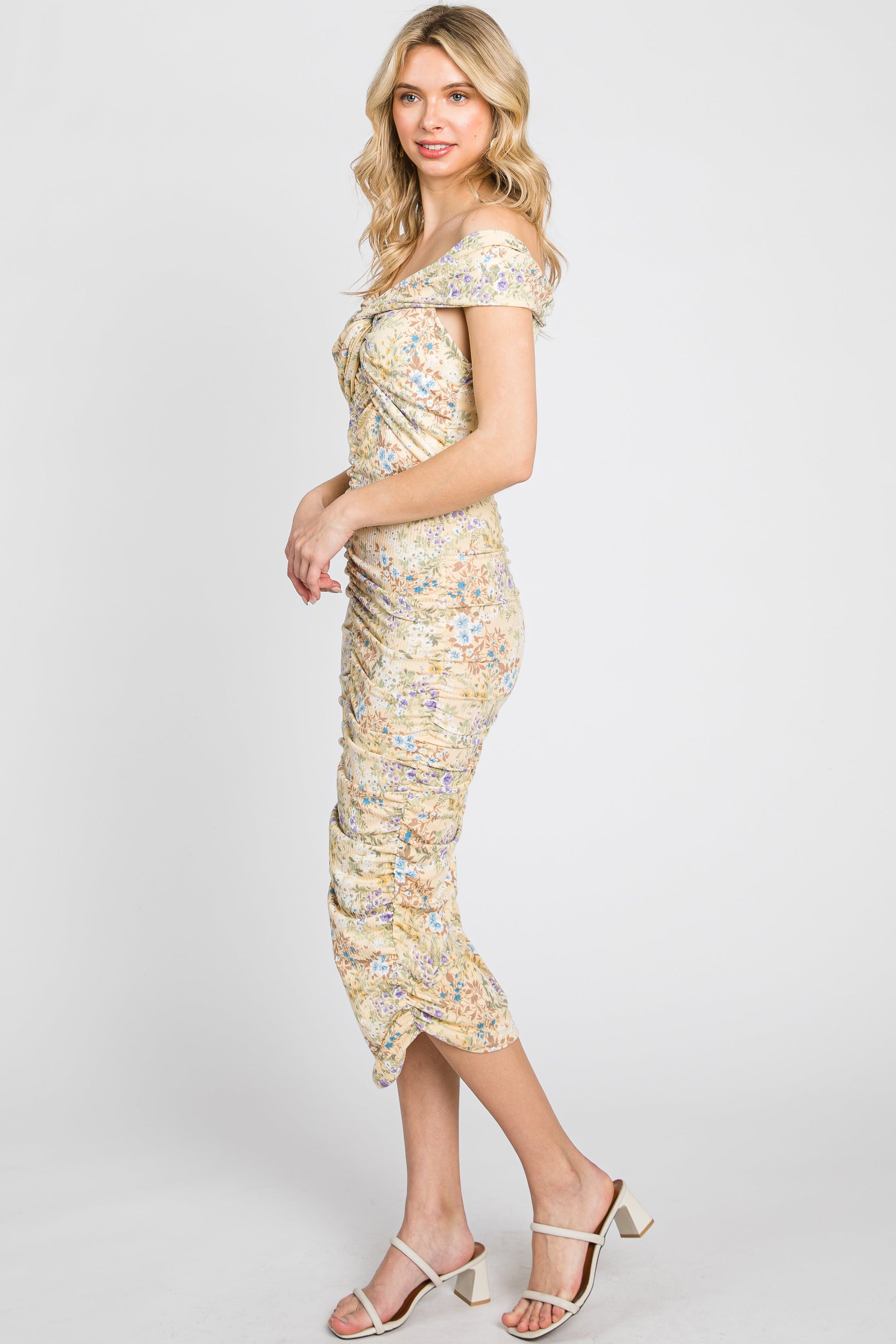 Yellow Floral Ribbed Ruched Off Shoulder Mid Dress