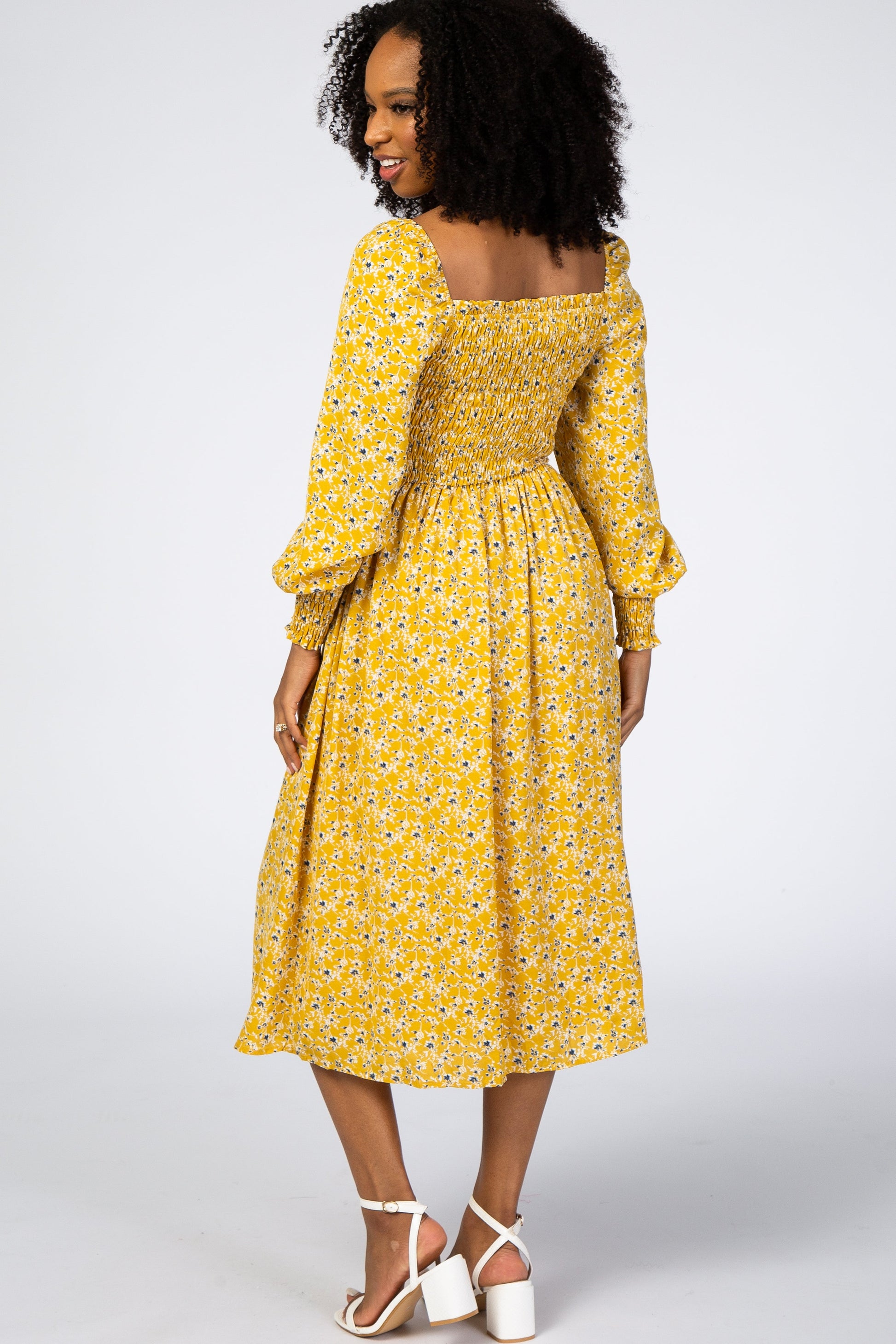 Yellow Floral Smocked Bubble Sleeve Midi Dress